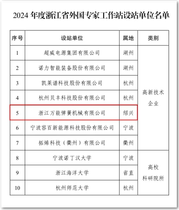 2024年、浙江万能バネ機械有限公司は紹興市で唯一選ばれた企業に選ばれ、再び紹興市が栄誉を獲得しました。この成果は、同社の技術革新と国際開発戦略を裏付けるものであるだけでなく、世界的な競争力における新たな一歩を示すものでもあります。
