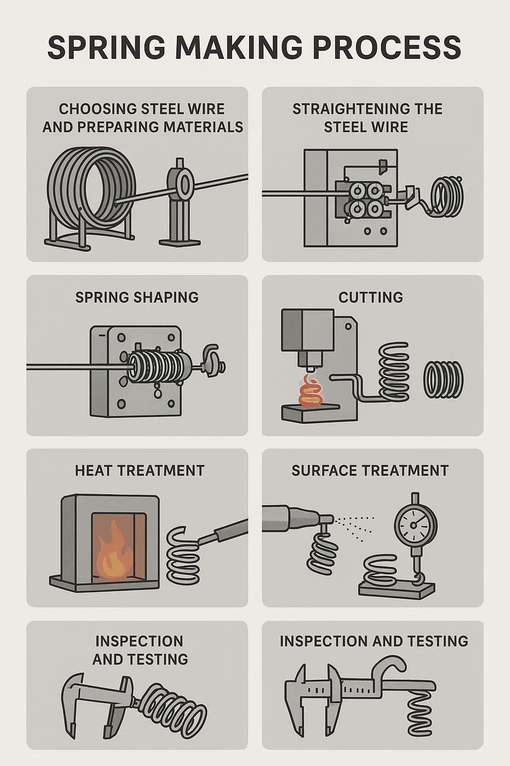 • 焼き入れ: スプリングを油または水の中に素早く入れ、鋼線を冷却して硬化します。