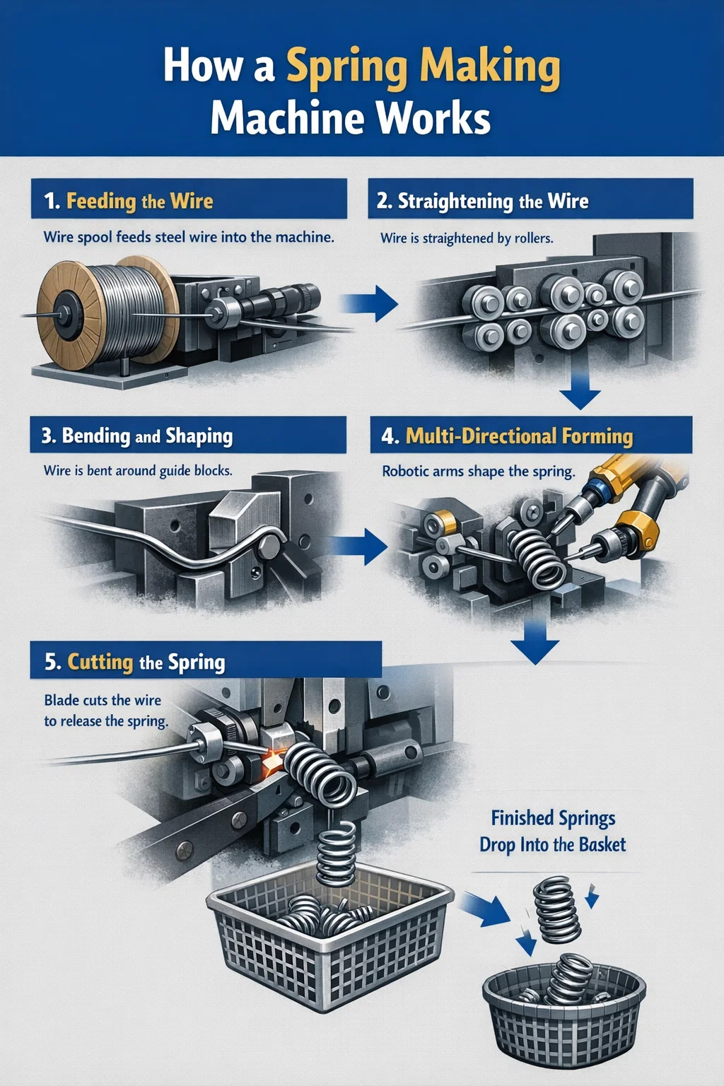 ばね製造機の作業プロセスはいくつかのステップに分けることができます。