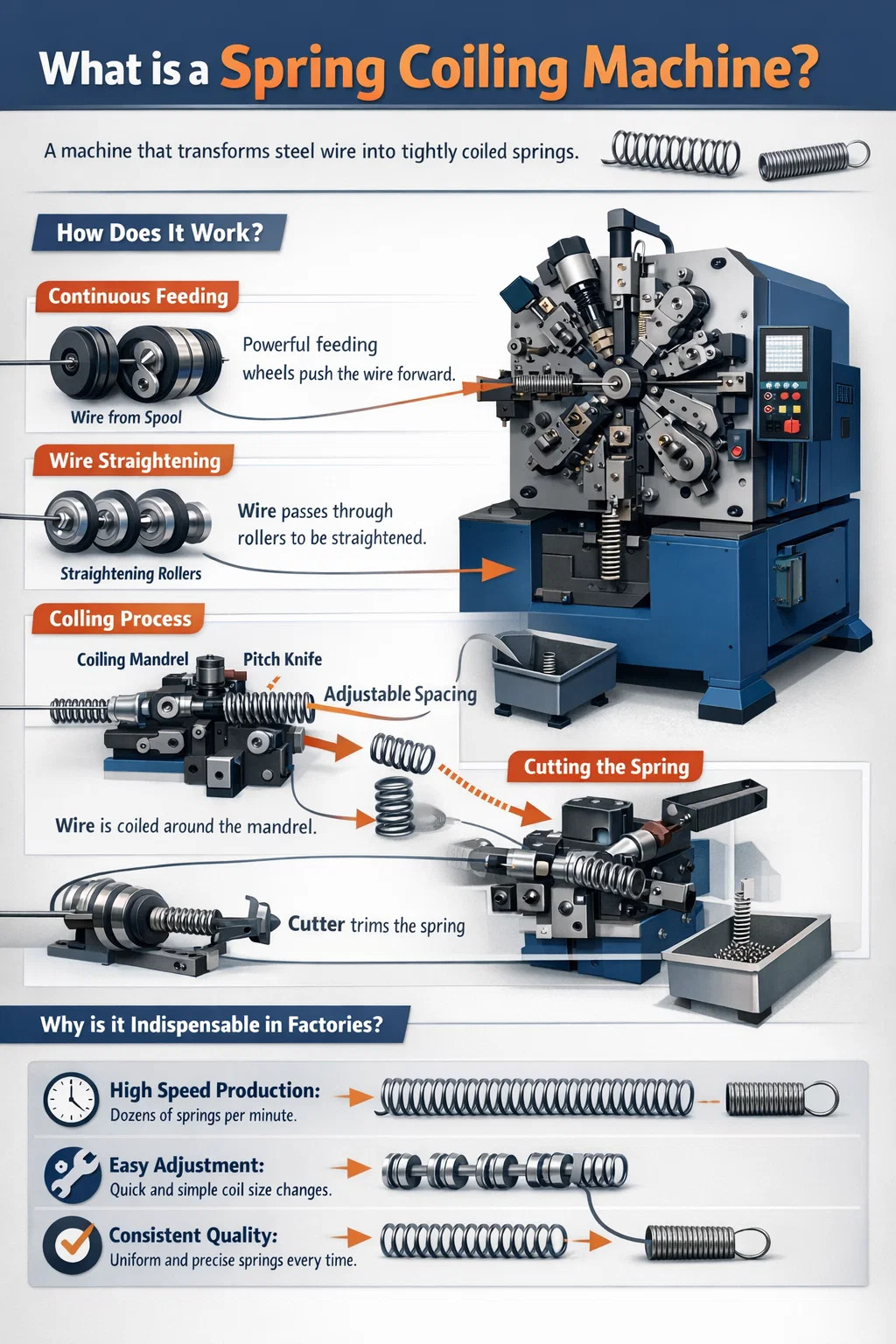 簡単に言うと、スプリングコイリングマシンは、金属線をらせん状に「コイル状に巻く」ために特別に設計された機械です。