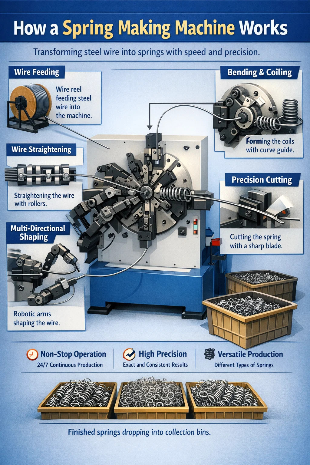 あ ばね製造機 は、金属線をさまざまな種類のバネに変換するために特別に設計された自動機械です。